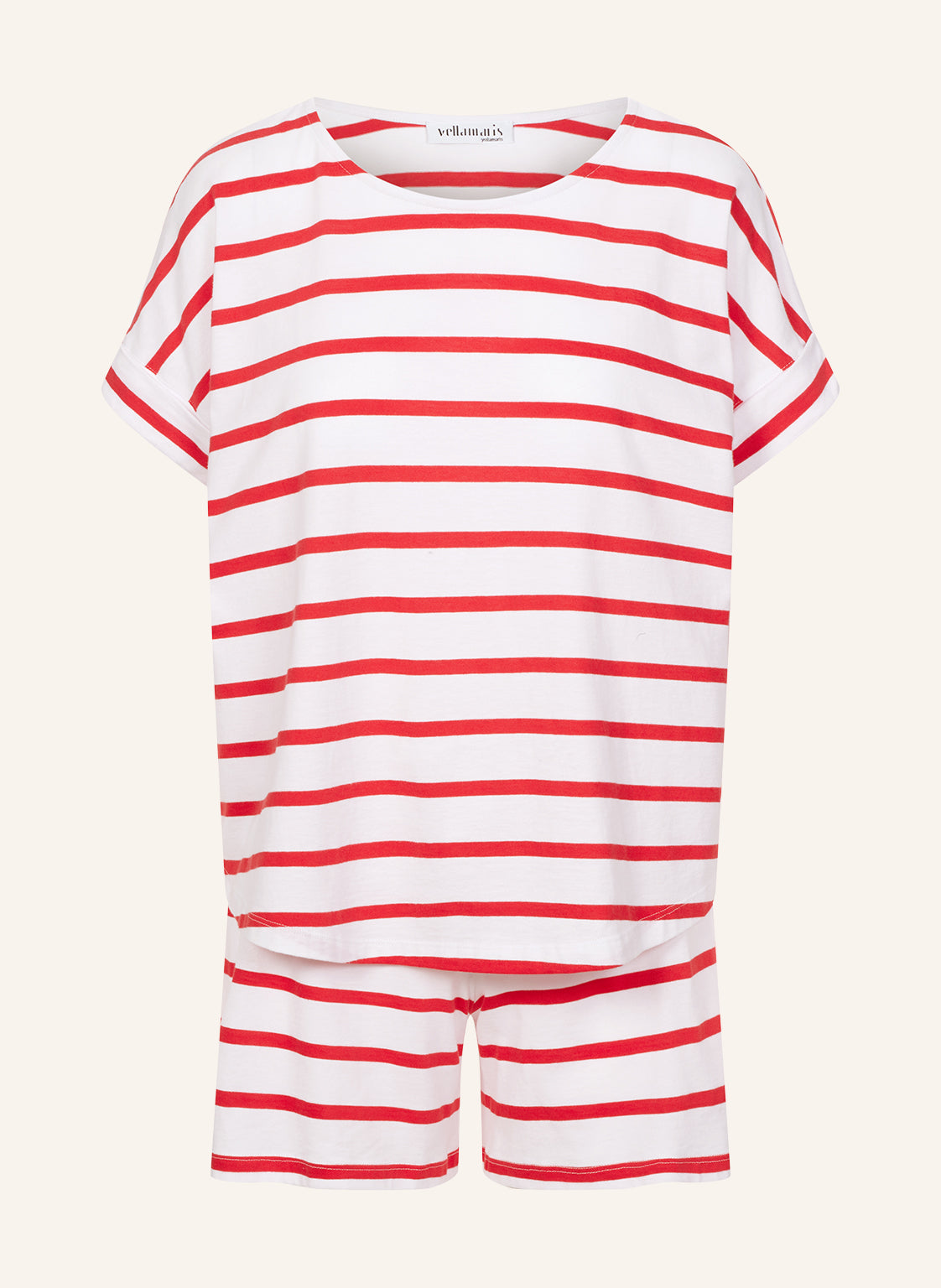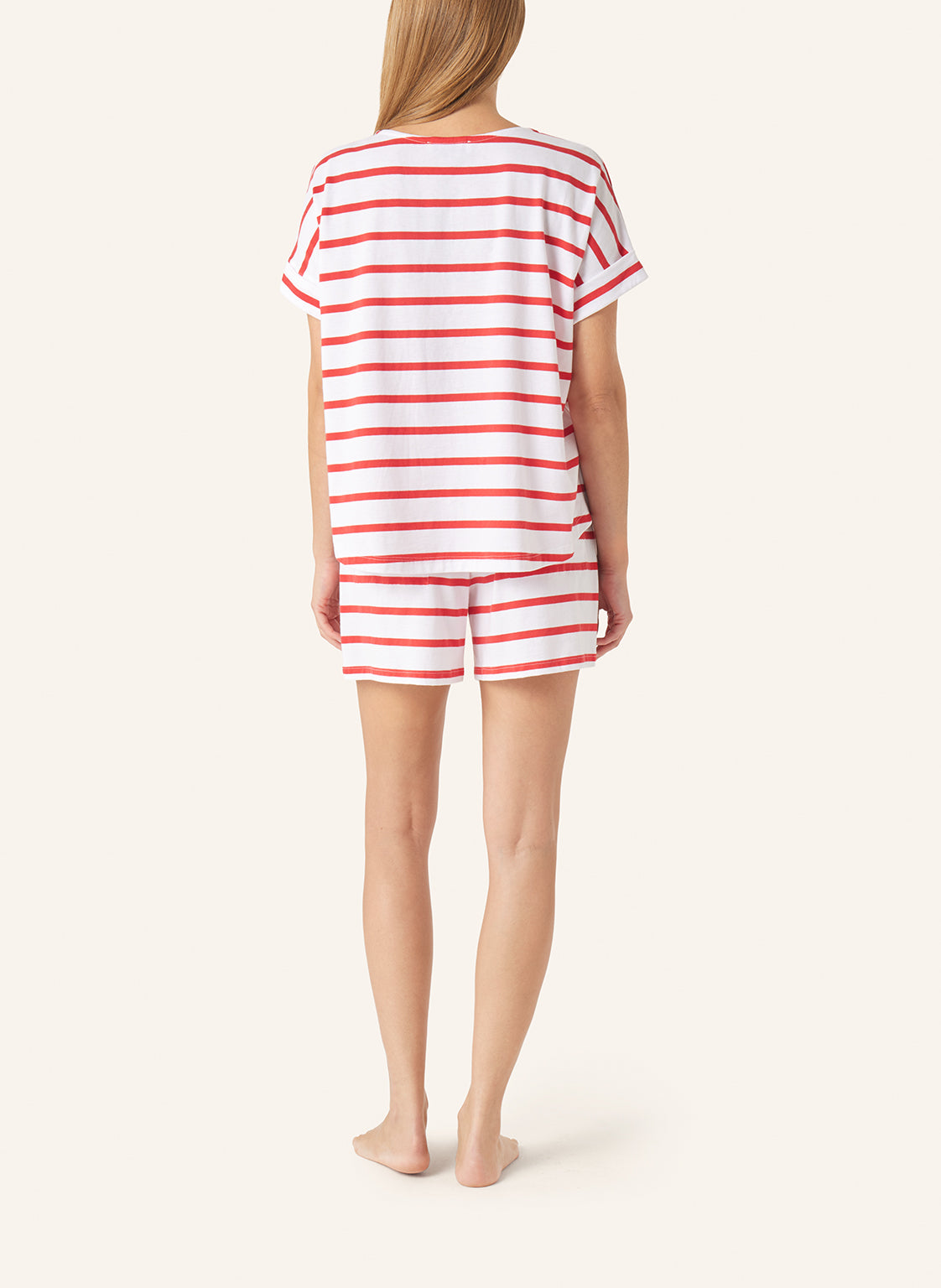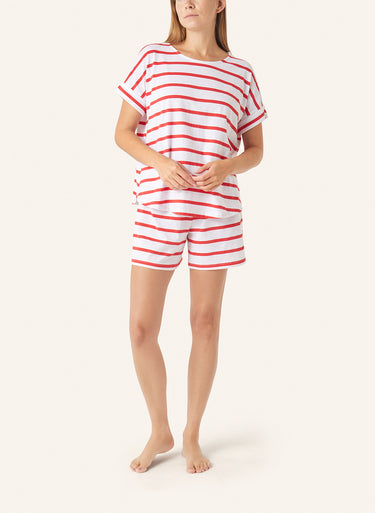 Lässig geschnittener Shorty Pyjama aus weichem Baumwolljersey made in Germany. Das Kurzarmshirt mit Rundhalsausschnitt hat überschnittene Schultern für extra viel Bewegungsfreiheit.